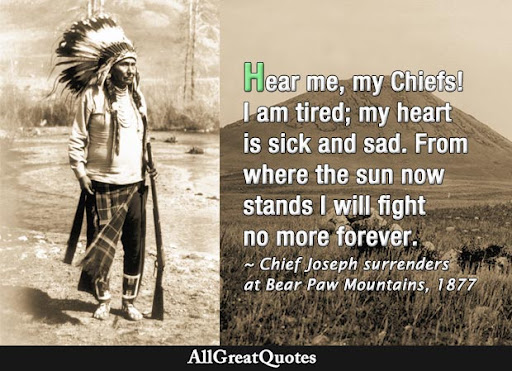 Share chief joseph quotations about country, heart and fathers. It is the young men . After 5 days of fighting, the remaining 431 members of the tribe surrendered. Howard, though, took the credit: Maybe i shall find them among the dead.